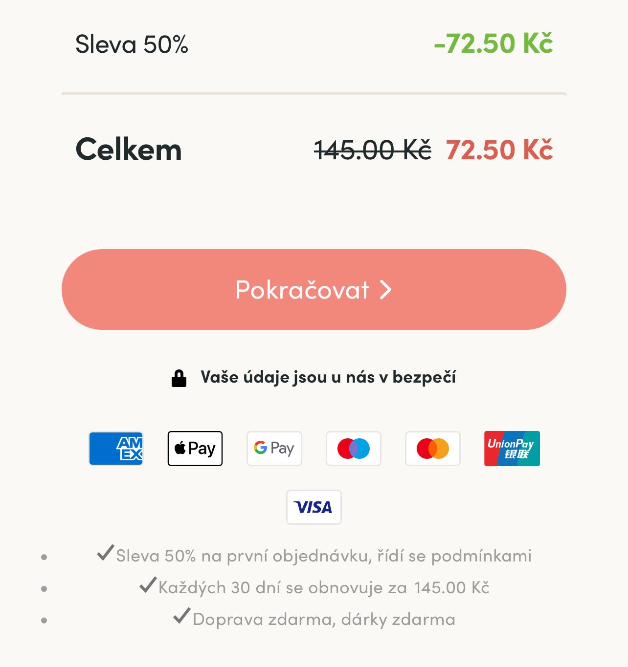 Sleva 50 % se vztahuje pouze na první měsíční balíček při aktivaci předplatného. Další objednávky se účtují za standardní cenu, pokud není zvolena jiná aktivní nabídka.